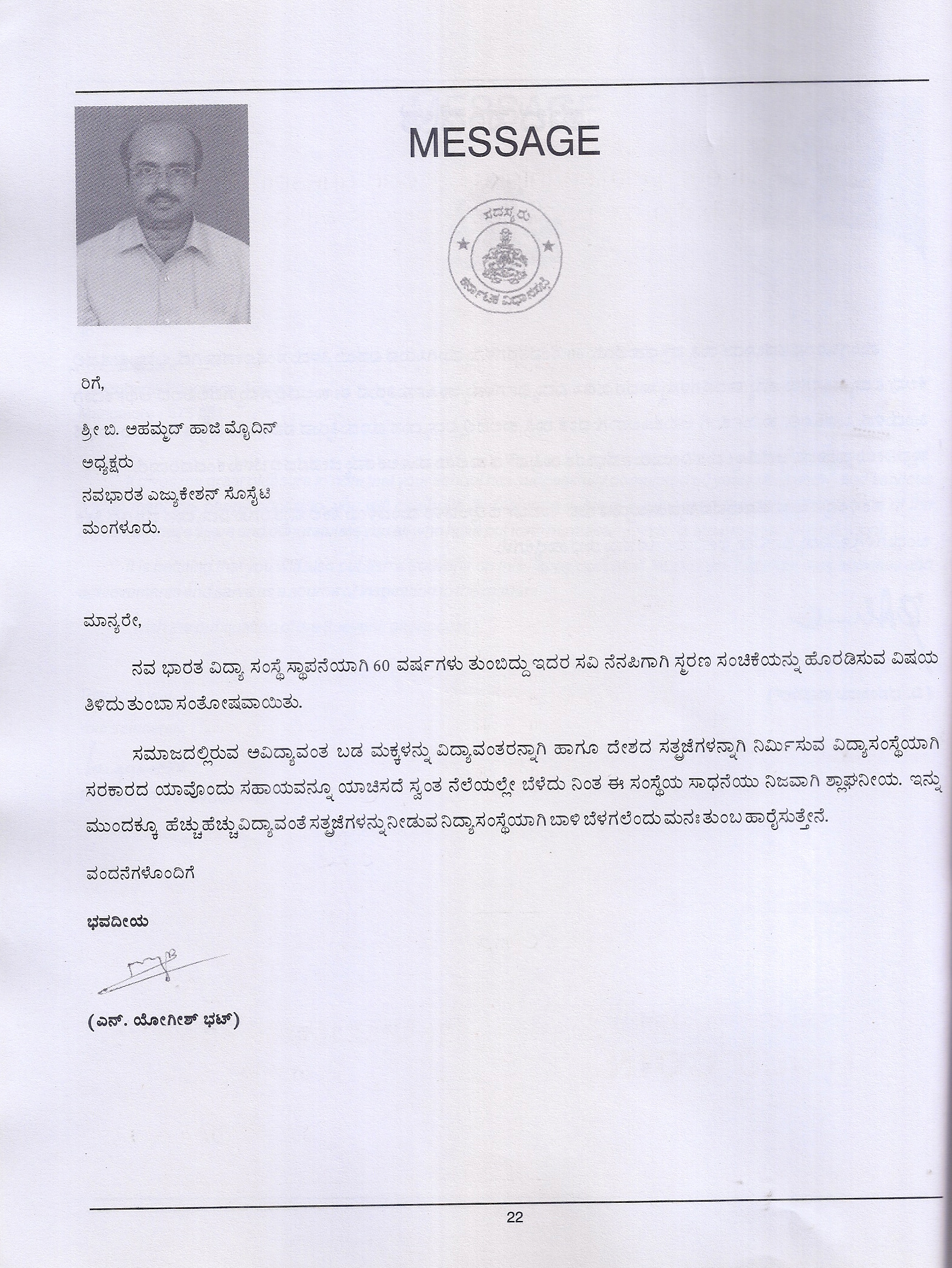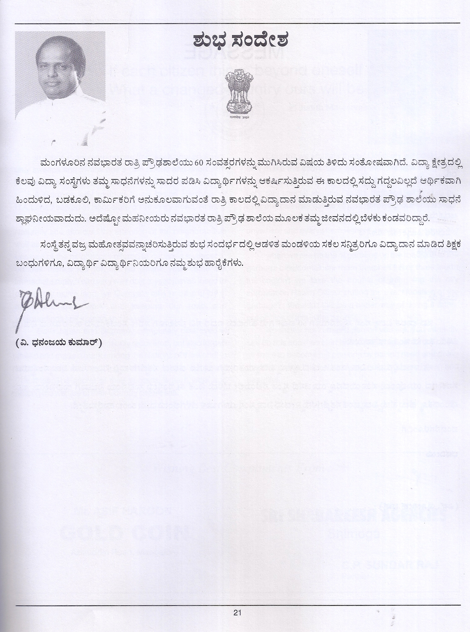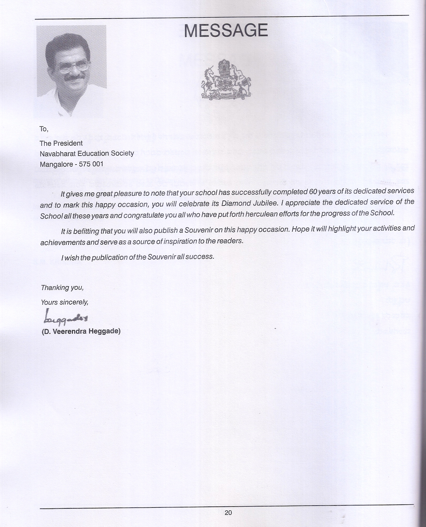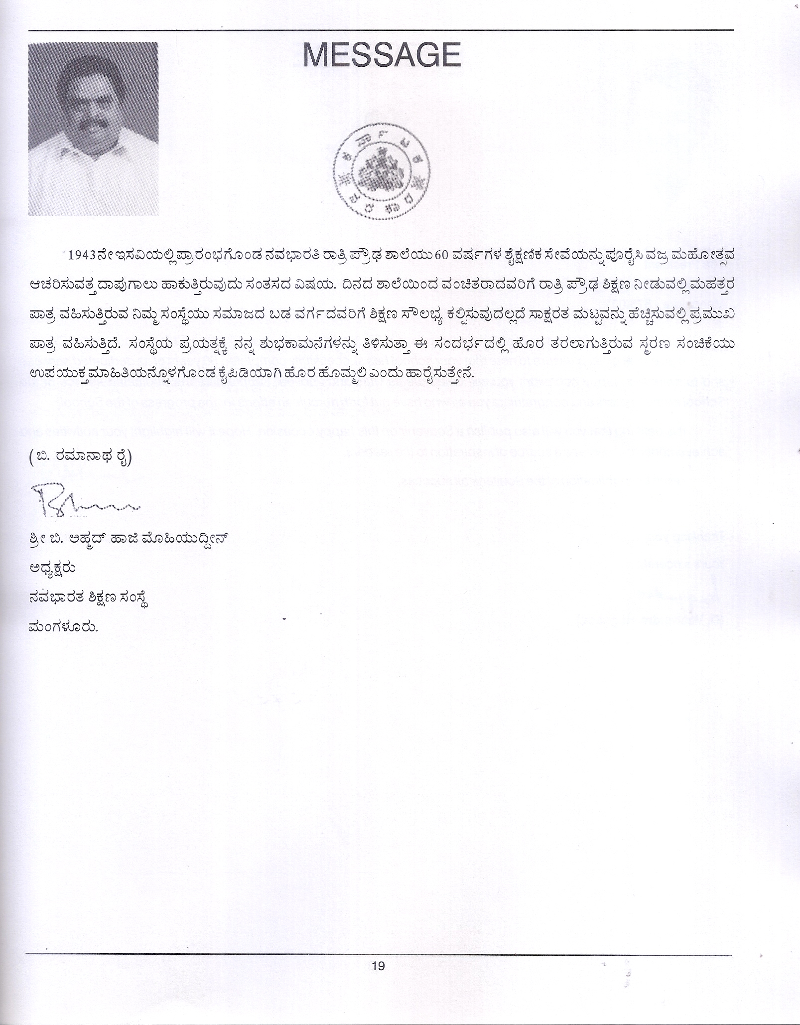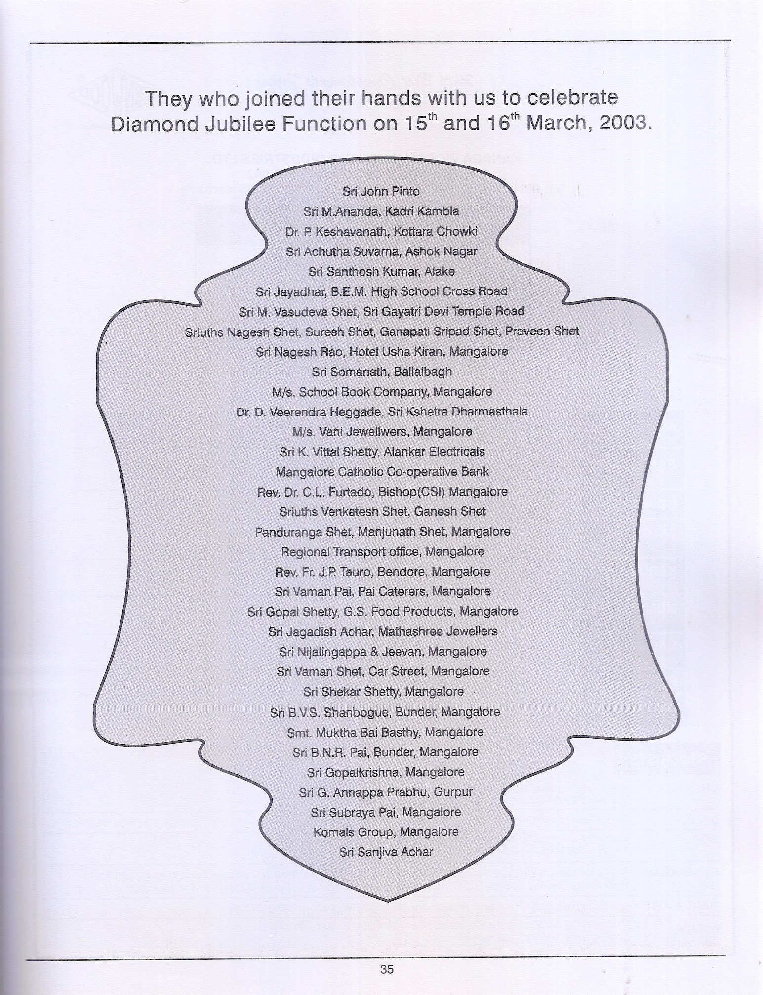 Diamond Jubilee Celebration Day 2 Main function was held on 16th of March 2003 at the school premises. The following Dignitaries graced the function with their esteemed presence as Chief Guests - Sri Sri Sri Shivaprakash Swamiji, Jangam Mutt, Sri Ramanath Rai, Minister of Transport, Government of Karnataka , Sri Y. Abdulla Kunhi Hajee,, Chairman, Yenepoya Medical & Dental Colleges, Sri Hajee Ahmed Mohiuddin, then President of Navabharat Education Society.