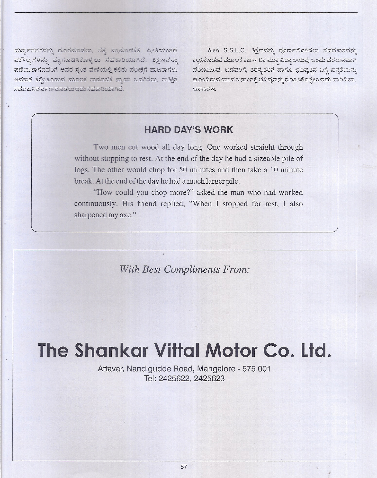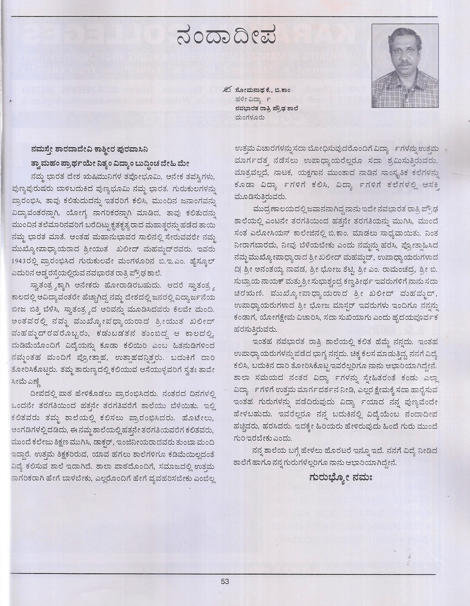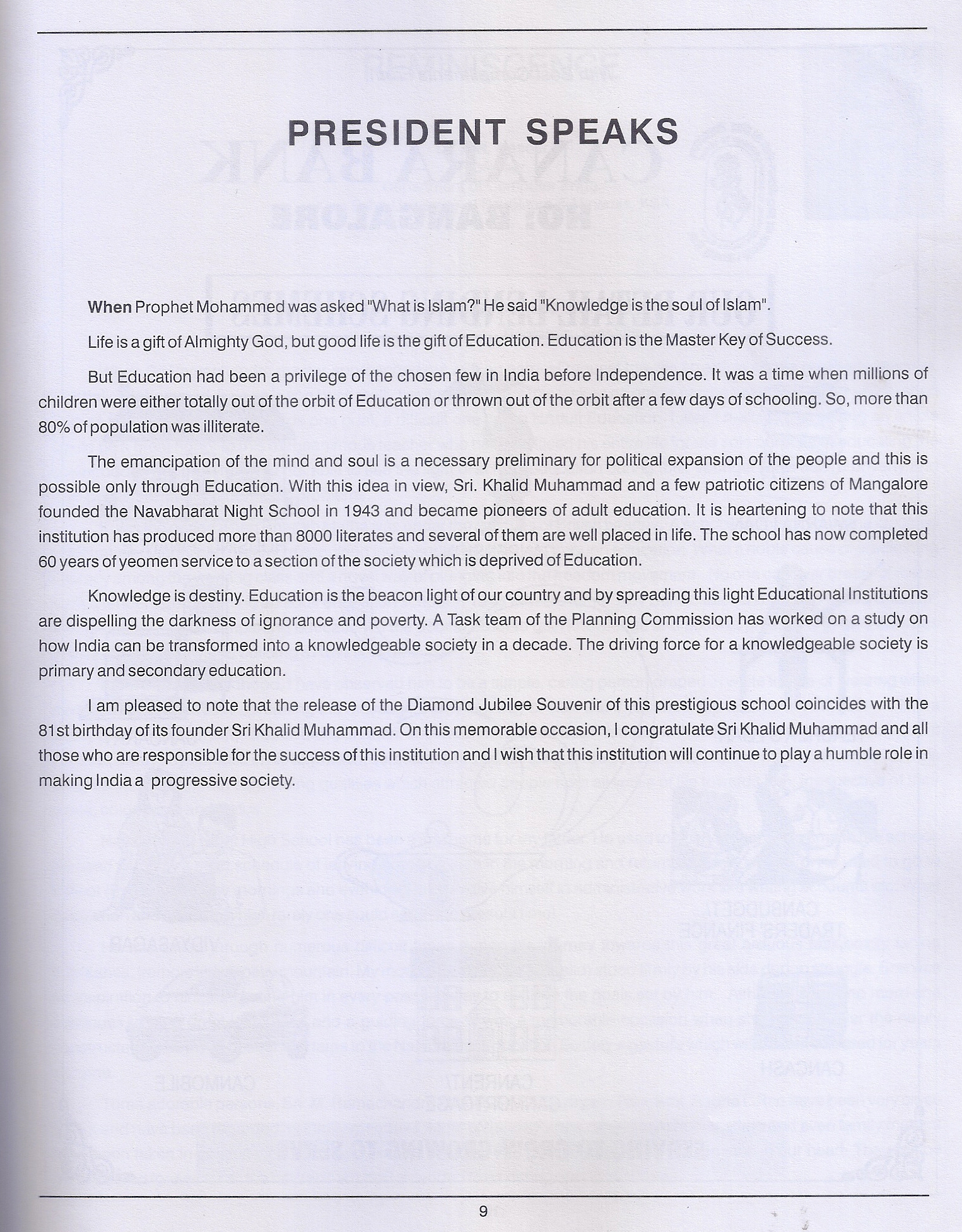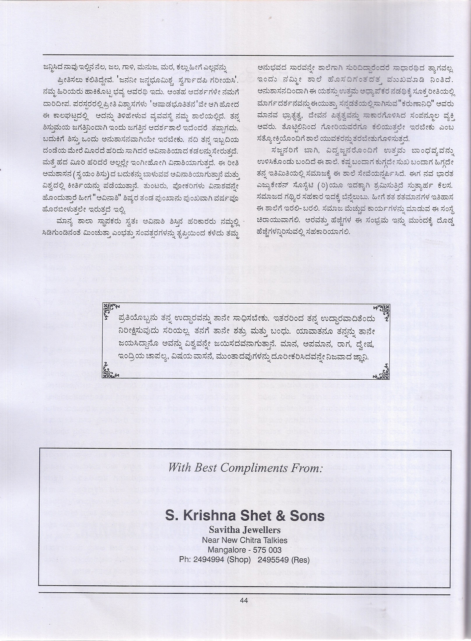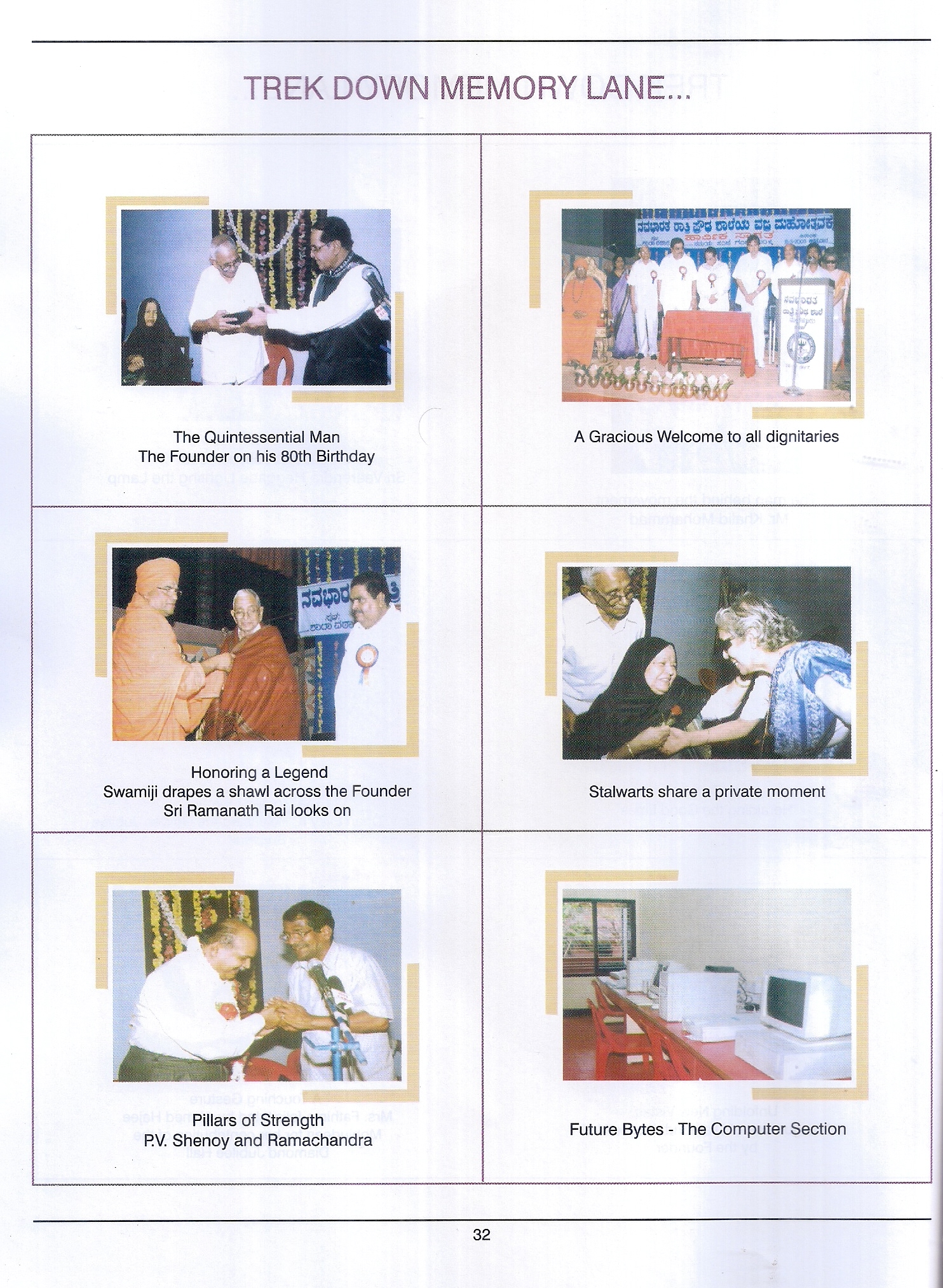 Diamond Jubilee Celebration Day 2 Main function was held on 16th of March 2003 at the school premises. The following Dignitaries graced the function with their esteemed presence as Chief Guests - Sri Sri Sri Shivaprakash Swamiji, Jangam Mutt, Sri Ramanath Rai, Minister of Transport, Government of Karnataka , Sri Y. Abdulla Kunhi Hajee,, Chairman, Yenepoya Medical & Dental Colleges, Sri Hajee Ahmed Mohiuddin, then President of Navabharat Education Society.
