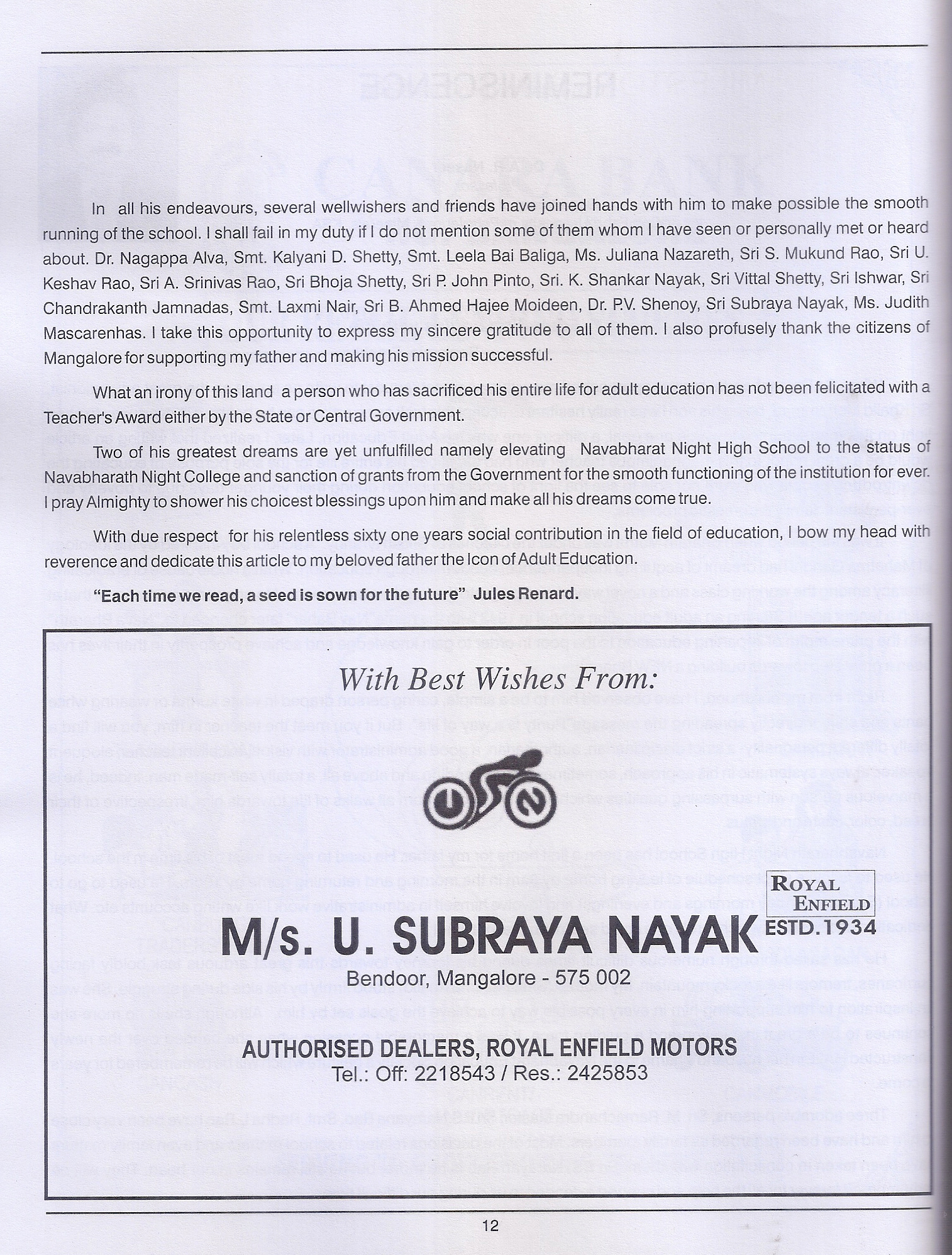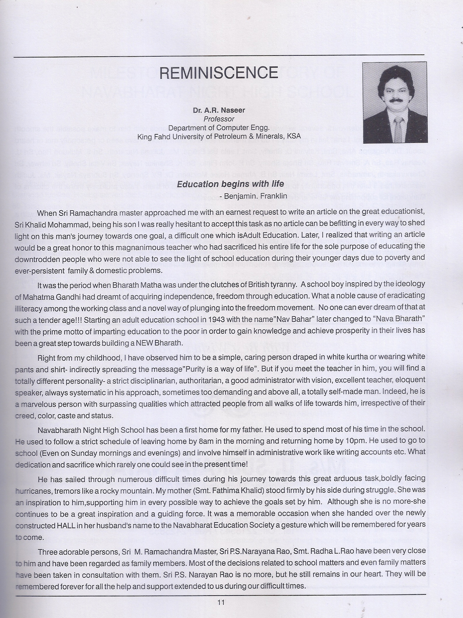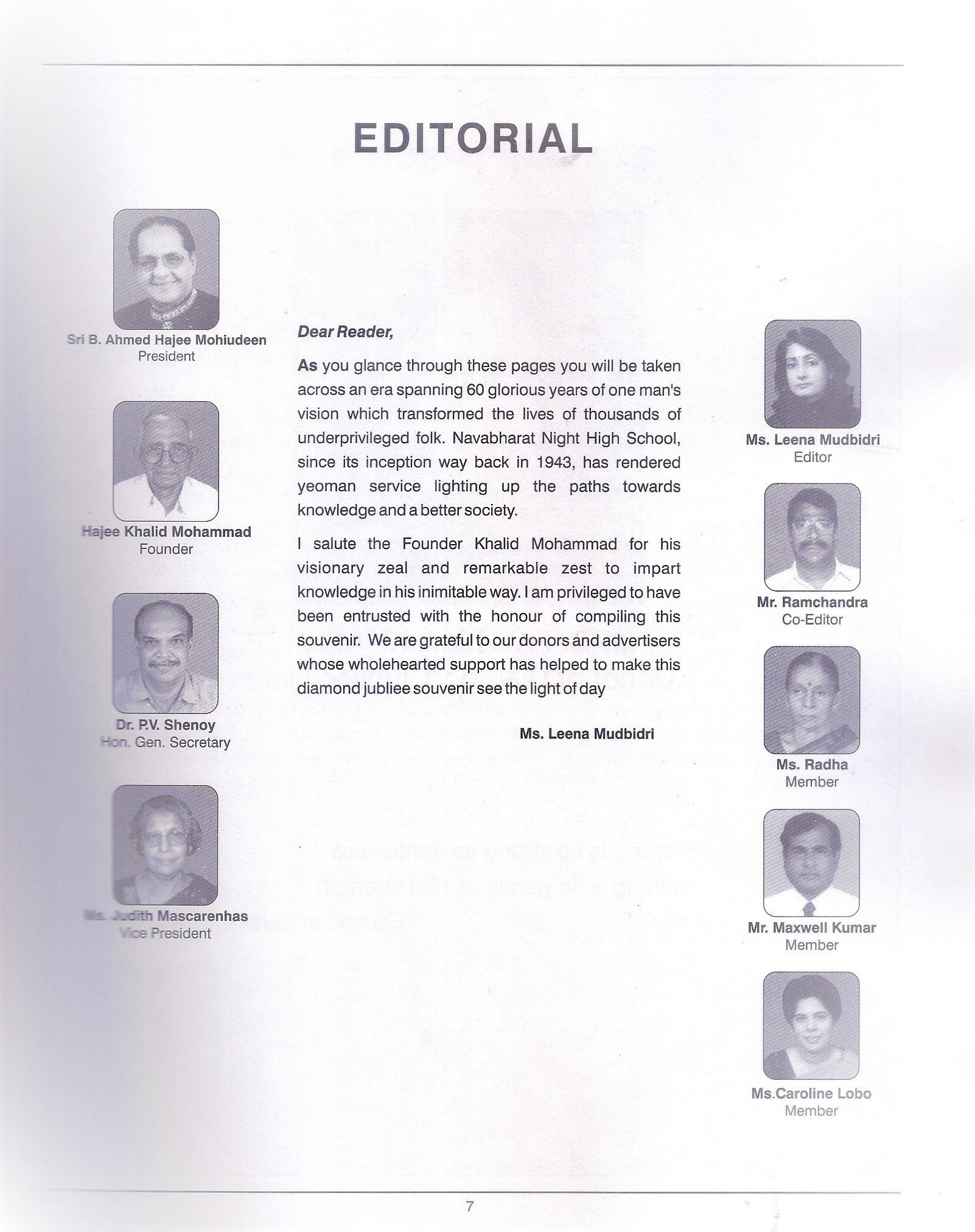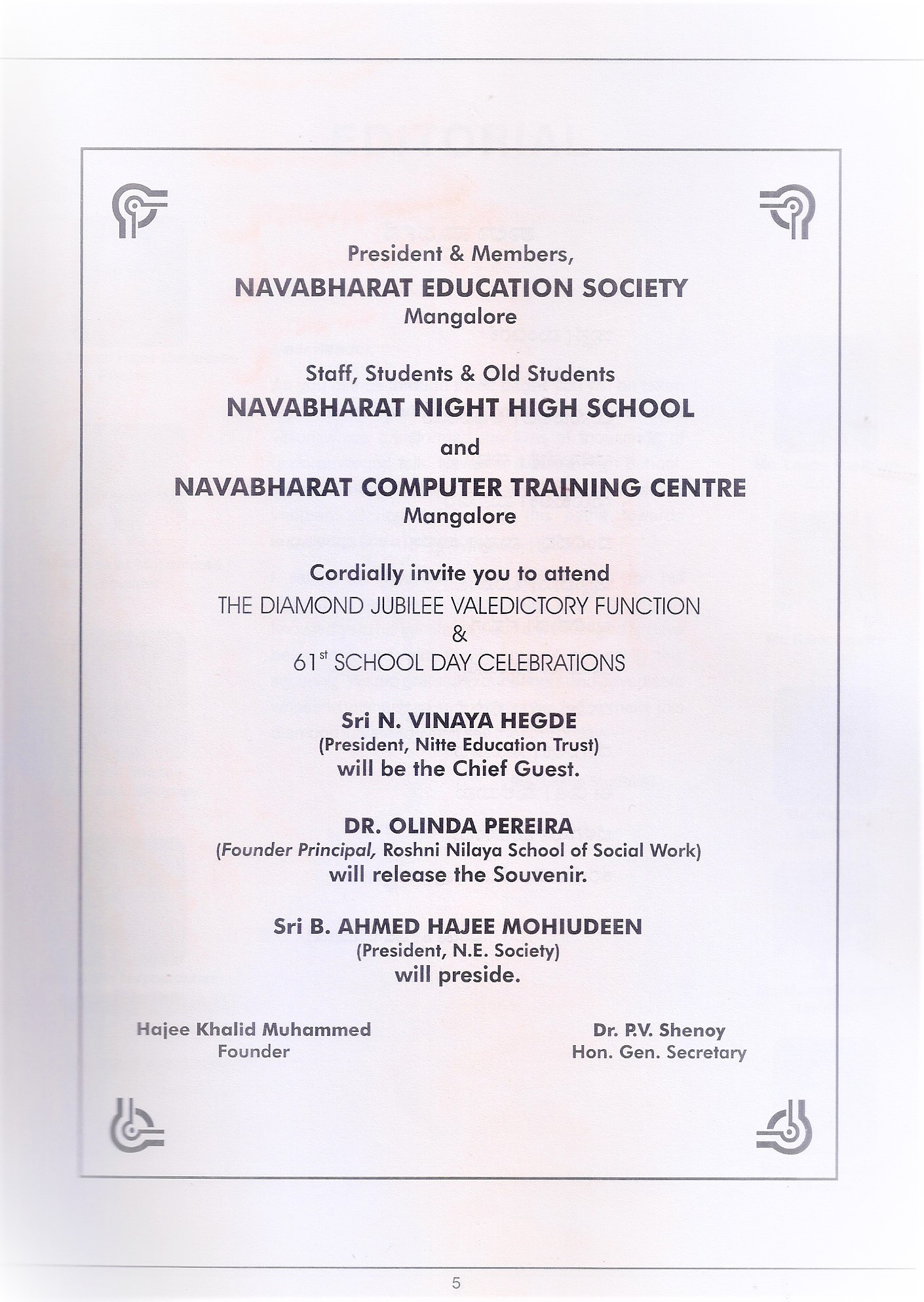Navabharat Night High School Diamond Jubilee Hall Inauguration and the Diamond Jubilee Celebration functions were held on two days 15th & 16th of March 2003 at the school premises.