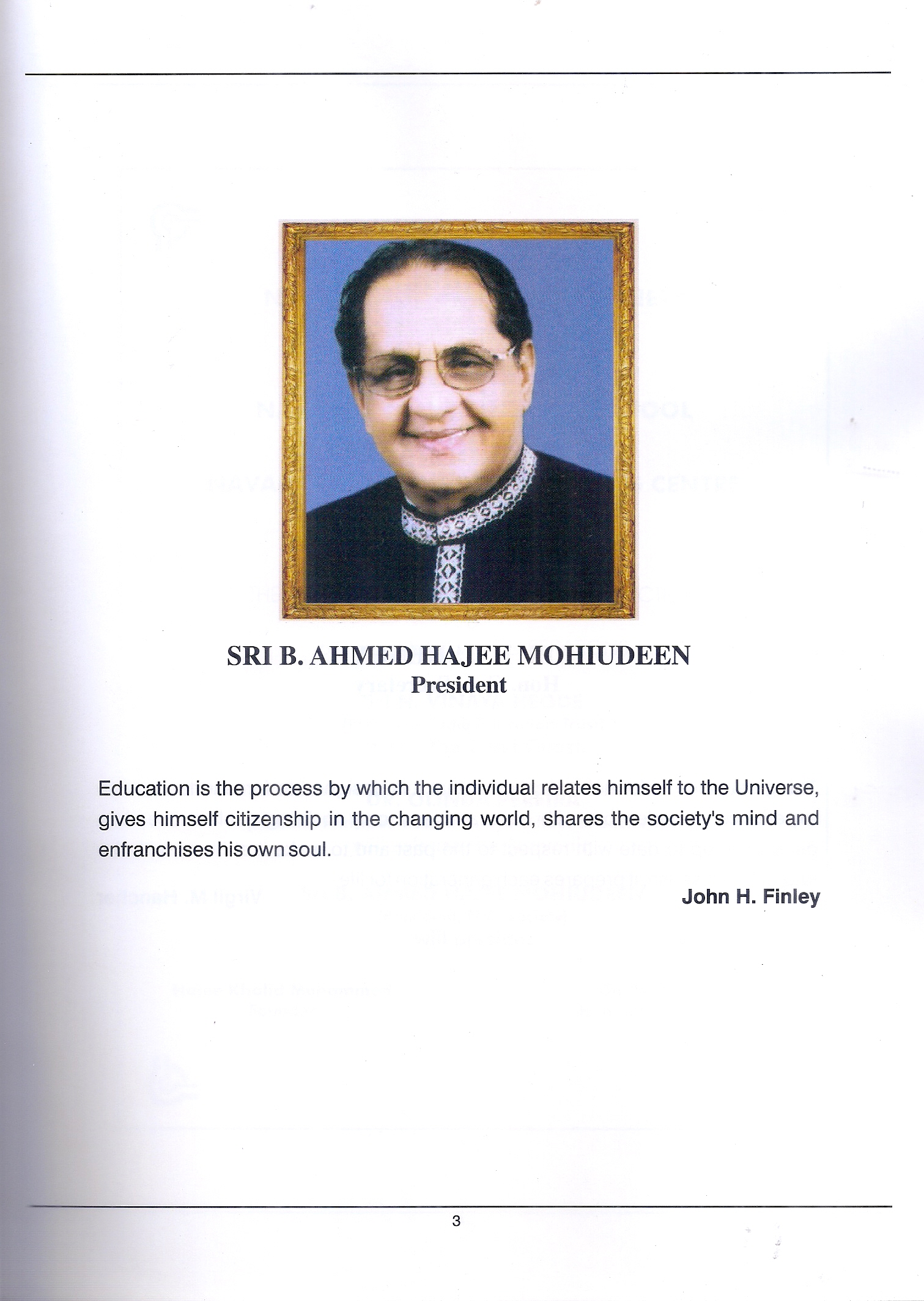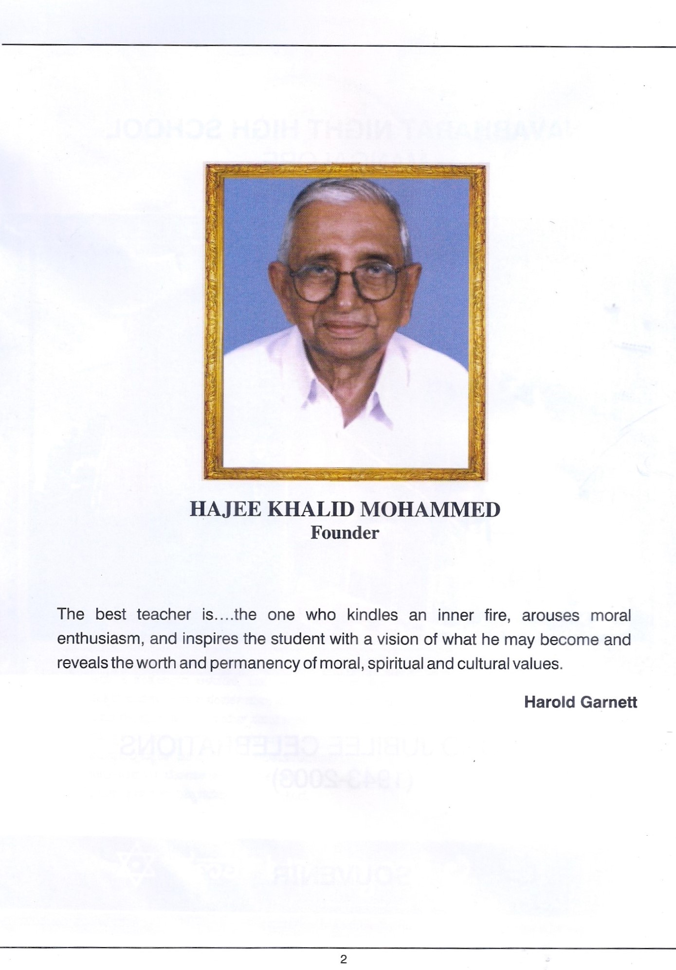 The Diamond Jubilee Hall was constructed by family members of the founder Late Sri Khalid Mohammad and named after him. It was donated to the school by his wife Late Fathima Khalid Mohammad by handing over the key of the Diamond Jubilee Hall to Late B. Ahmed Hajee Mohiddin, then President of the School at a grand Day 1 function organized on 15th March 2003.