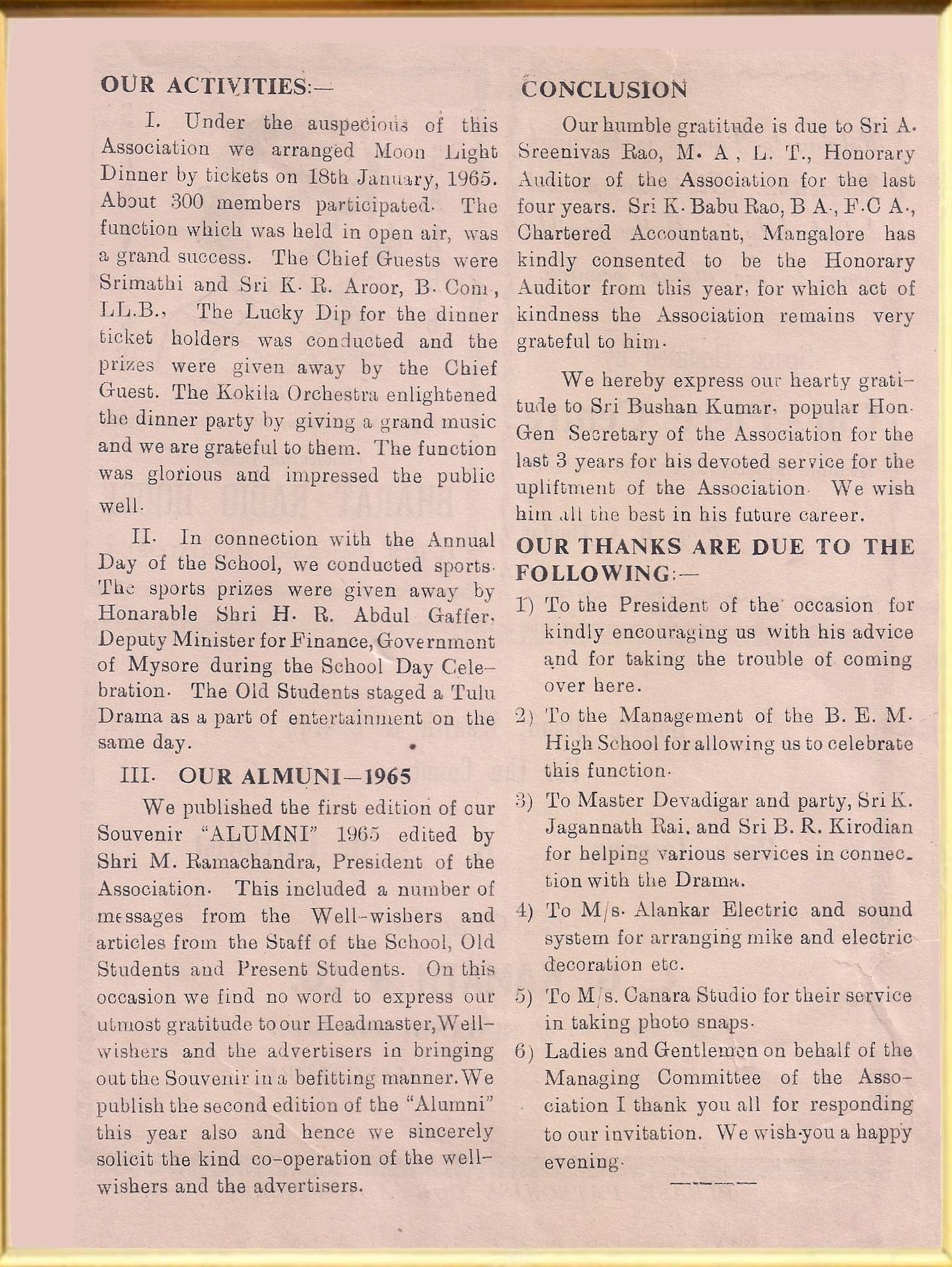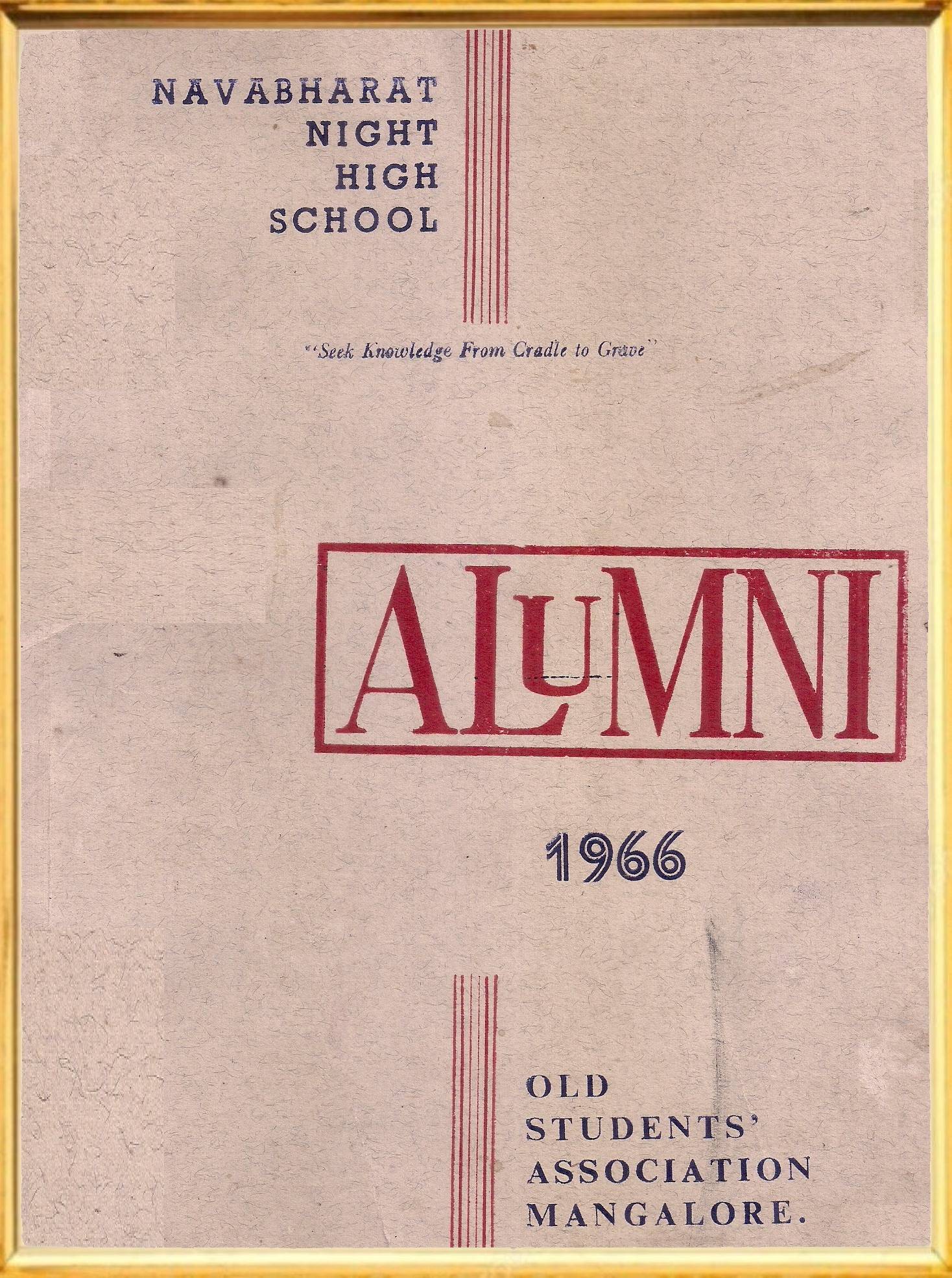 ಅವರು 1965 ರಲ್ಲಿ ತಮ್ಮ ಸ್ಮರಣಿಕೆ "ಅಲುಮ್ನಿ" ಯ ಮೊದಲ ಆವೃತ್ತಿಯನ್ನು ಹೊರತಂದರು, ಇದನ್ನು ಸಂಘದ ಅಧ್ಯಕ್ಷರಾದ ಶ್ರೀ ಎಂ. ರಾಮಚಂದ್ರ ಅವರು ಸಂಪಾದಿಸಿದ್ದಾರೆ. "ಅಲುಮ್ನಿ" ಯ ಈ ಸಂಚಿಕೆಯನ್ನು ನವಭಾರತ ರಾತ್ರಿ ಪ್ರೌಢಶಾಲೆಗೆ ತಮ್ಮ ಅಮೂಲ್ಯವಾದ ಸೇವೆಗಳ ಗೌರವಾನ್ವಿತ ಅನ್ವಯಕ್ಕಾಗಿ ಈ ಕೆಳಗಿನ ನಾಲ್ಕು ಪ್ರತಿಷ್ಠಿತ ವ್ಯಕ್ತಿಗಳಿಗೆ ಸಮರ್ಪಿಸಲಾಯಿತು - ಡಾ. ಕೆ. ನಾಗಪ್ಪ ಆಳ್ವ, M.B.B.S., ಶಾಸಕರು, 1950 ರಿಂದ 1961 ರವರೆಗೆ ಶಾಲೆಯ ಅಧ್ಯಕ್ಷರು (ಮಾಜಿ ಮೈಸೂರು ಸರ್ಕಾರದ ಆರೋಗ್ಯ ಸಚಿವರು), ಶ್ರೀ ಯು.ಕೇಶವ ರಾವ್, ಬಿ.ಎ., ಎಲ್.ಟಿ., 1954 ರಿಂದ 1965 ರವರೆಗೆ ಶಾಲೆಯ ಉಪಾಧ್ಯಕ್ಷರು, ಶ್ರೀಮತಿ. ಕೆ.ರಾಧಾ ಎಲ್.ರಾವ್, ಬಿ.ಎ., ಎಲ್.ಟಿ., 1950 ರಿಂದ 1965 ರವರೆಗೆ ಶಾಲೆಯ ಗೌರವ ಜಂಟಿ ಕಾರ್ಯದರ್ಶಿ, ಶ್ರೀ ಎ. ಶ್ರೀನಿವಾಸ ರಾವ್, ಎಂ.ಎ., ಎಲ್.ಟಿ., 1951 ರಿಂದ 1965 ರವರೆಗೆ ಶಾಲೆಯ ಅತ್ಯುತ್ತಮ ಶಿಕ್ಷಕ. click here for images