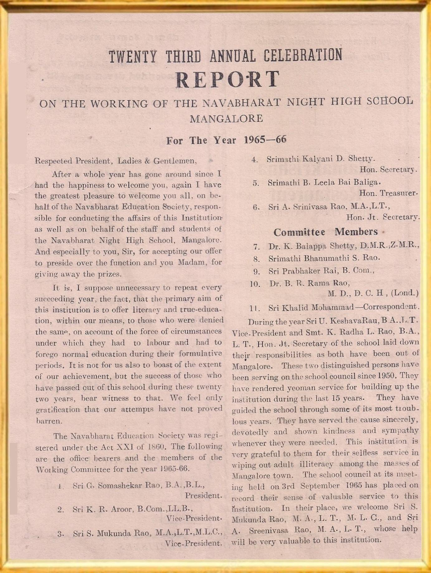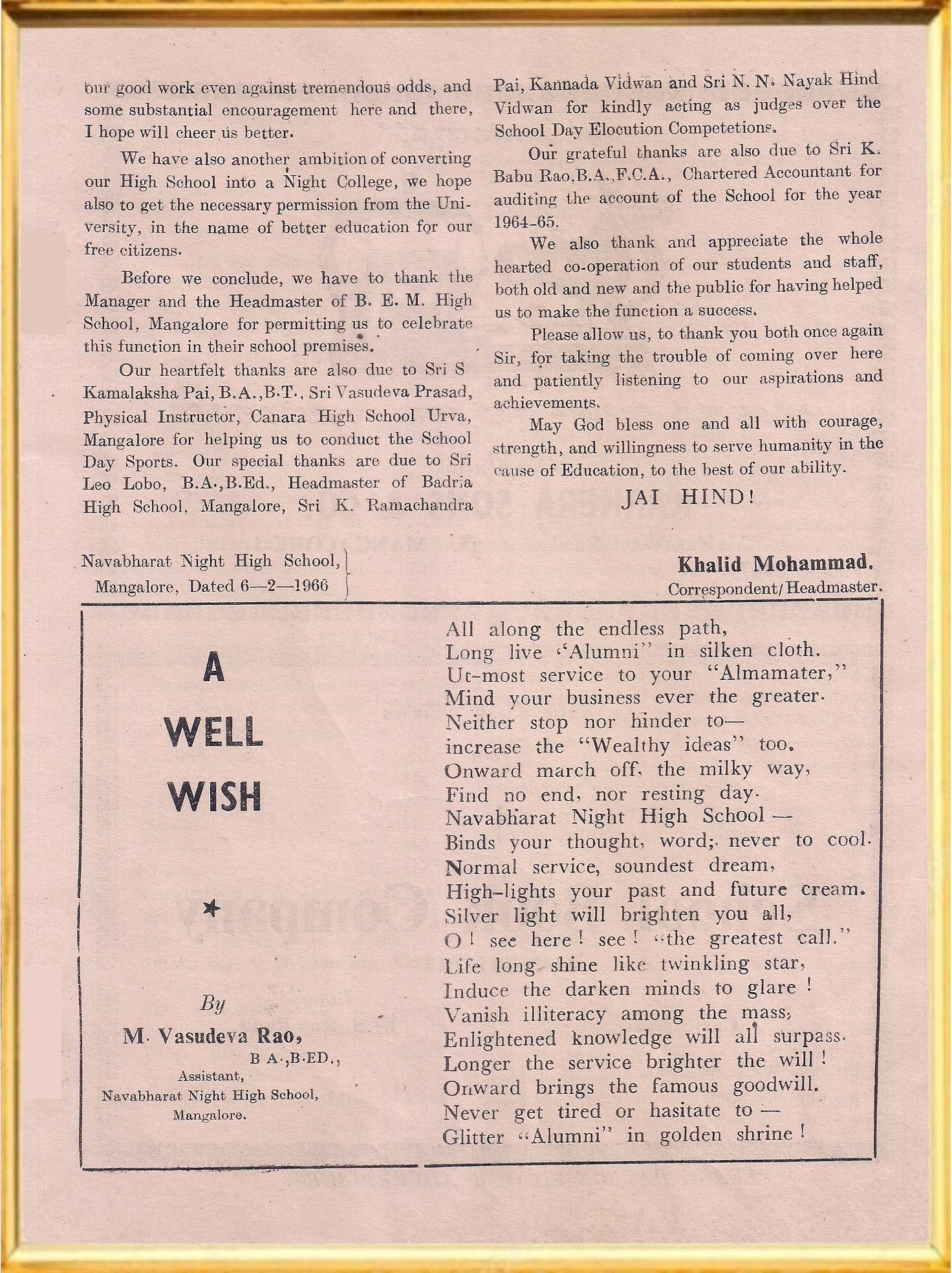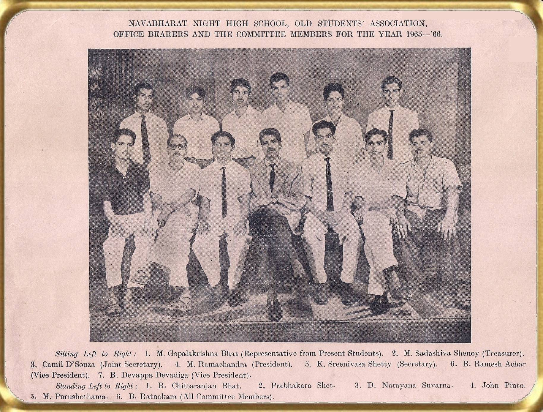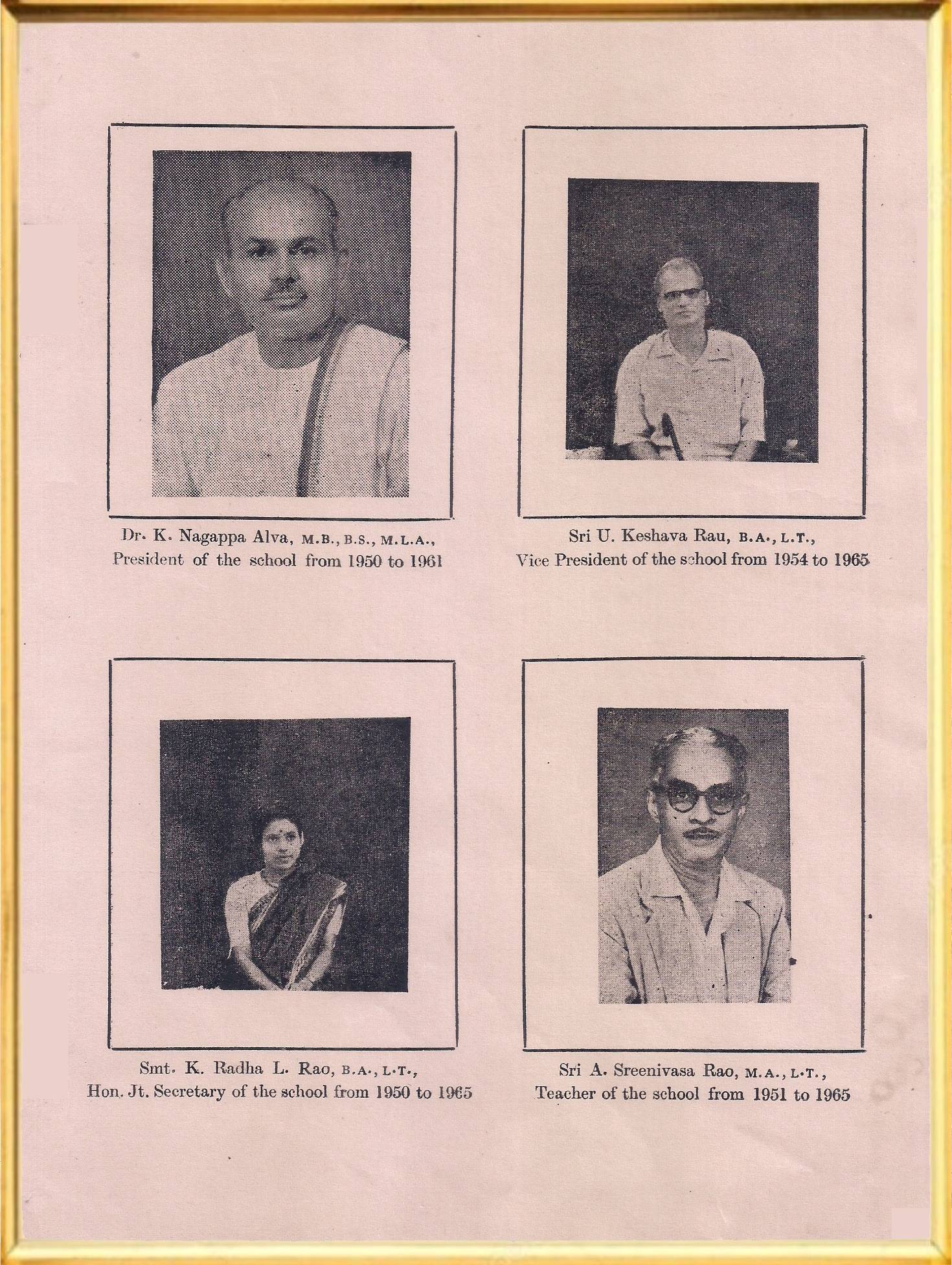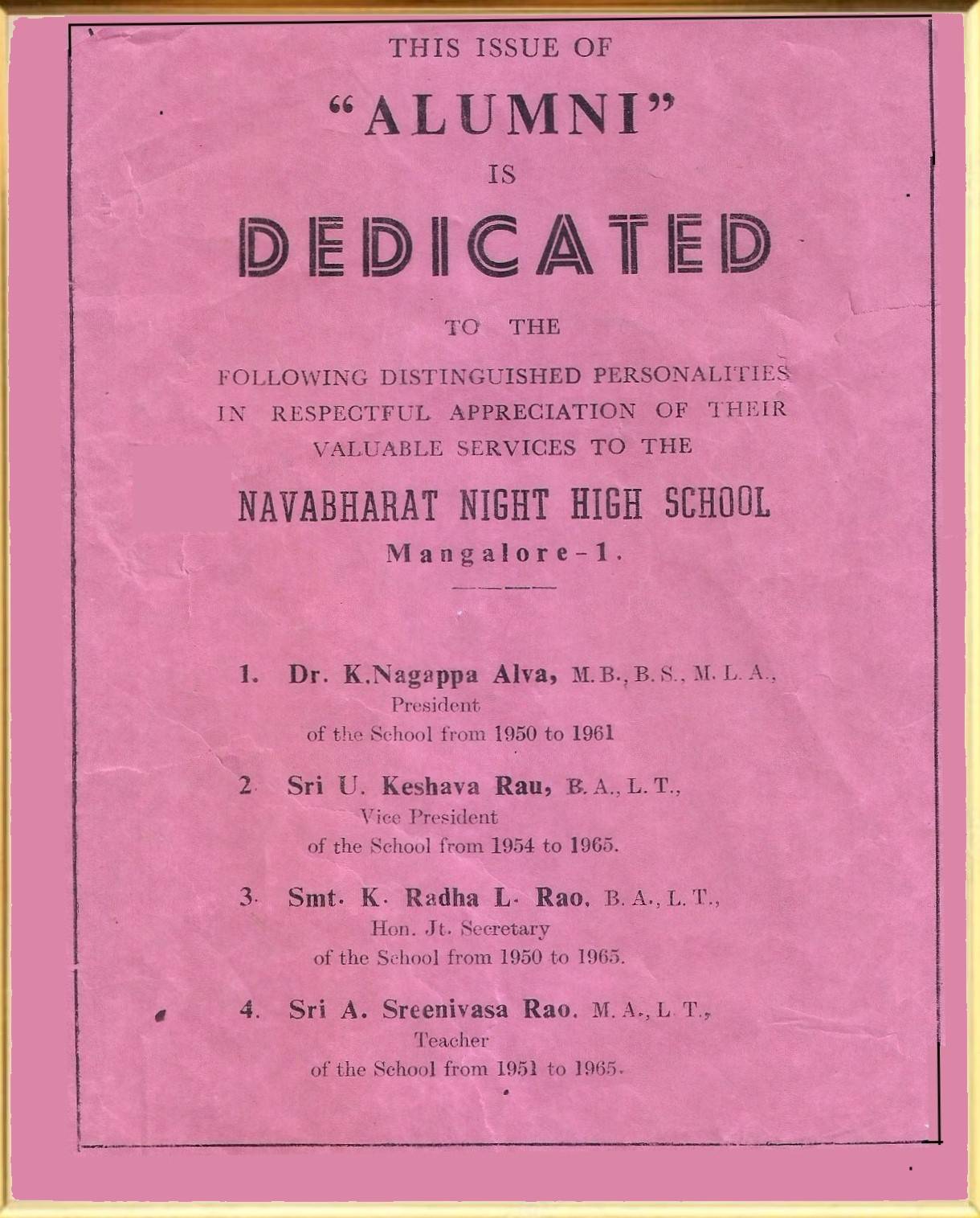 They brought out the first edition of their Souvenir “ALUMNI” in 1965 edited by Sri M. Ramachandra, President of the Association. This issue of “ALUMNI” was dedicated to the following four Distinguished Personalities in respectful application of their valuable Services to the Navabharat Night High School – Dr. K. Nagappa Alva, M.B.B.S., MLA, President of the school from 1950 to 1961 (former Health Minister of Govt. of Mysore), Sri U. Keshava Rao, B.A., L.T., Vice President of the School from 1954 to 1965, Smt. K. Radha L. Rao, B.A., L.T., Honorary Joint Secretary of the school from 1950 to 1965, Sri A. Sreenivasa Rao, M.A., L.T., Best Teacher of the School from 1951 to 1965. click here for pic