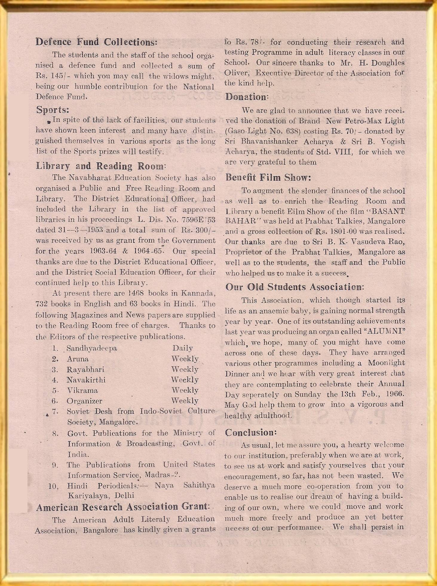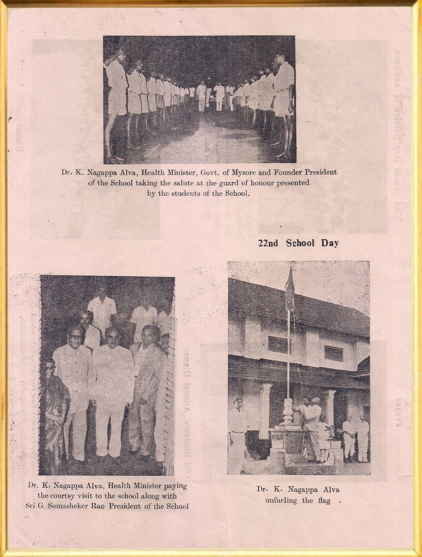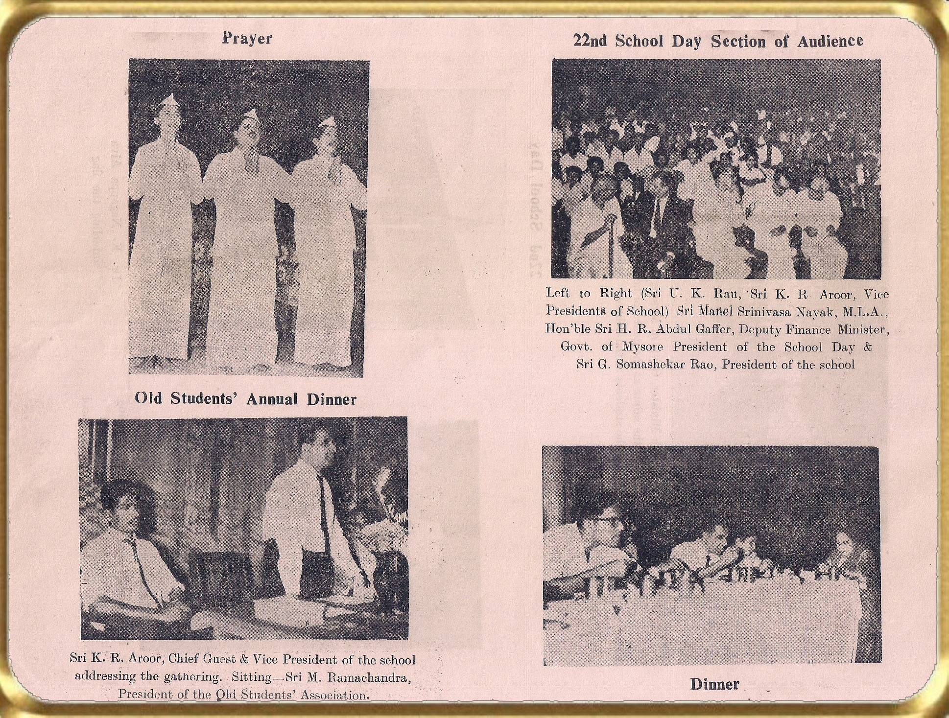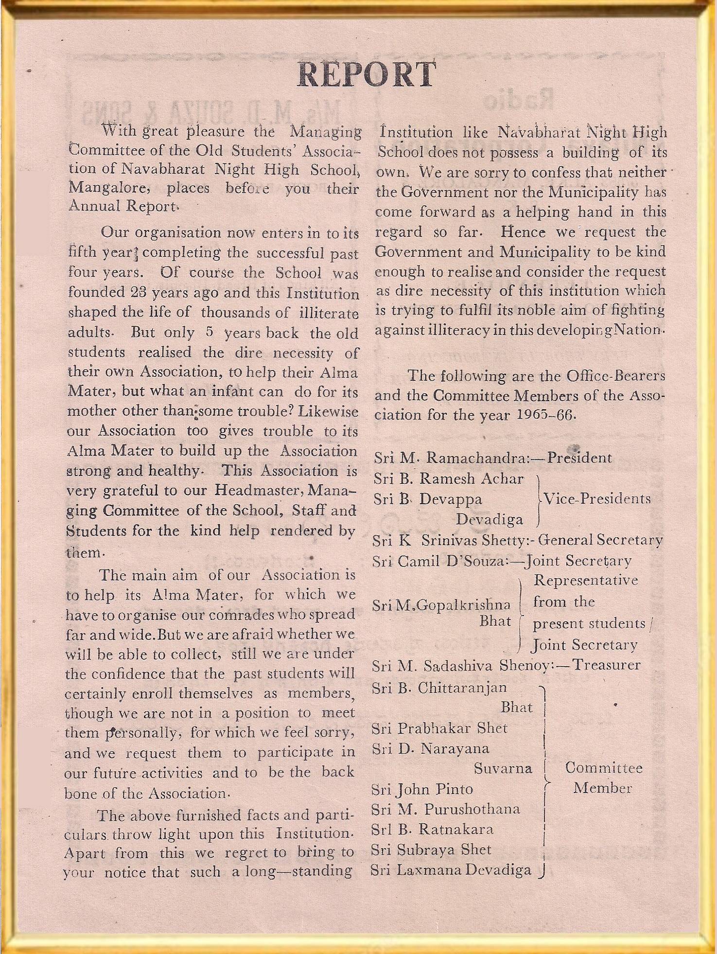 They brought out the first edition of their Souvenir “ALUMNI” in 1965 edited by Sri M. Ramachandra, President of the Association. This issue of “ALUMNI” was dedicated to the following four Distinguished Personalities in respectful application of their valuable Services to the Navabharat Night High School – Dr. K. Nagappa Alva, M.B.B.S., MLA, President of the school from 1950 to 1961 (former Health Minister of Govt. of Mysore), Sri U. Keshava Rao, B.A., L.T., Vice President of the School from 1954 to 1965, Smt. K. Radha L. Rao, B.A., L.T., Honorary Joint Secretary of the school from 1950 to 1965, Sri A. Sreenivasa Rao, M.A., L.T., Best Teacher of the School from 1951 to 1965. click here for pic