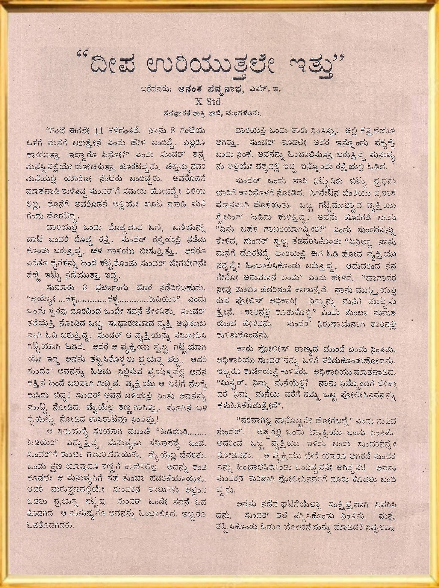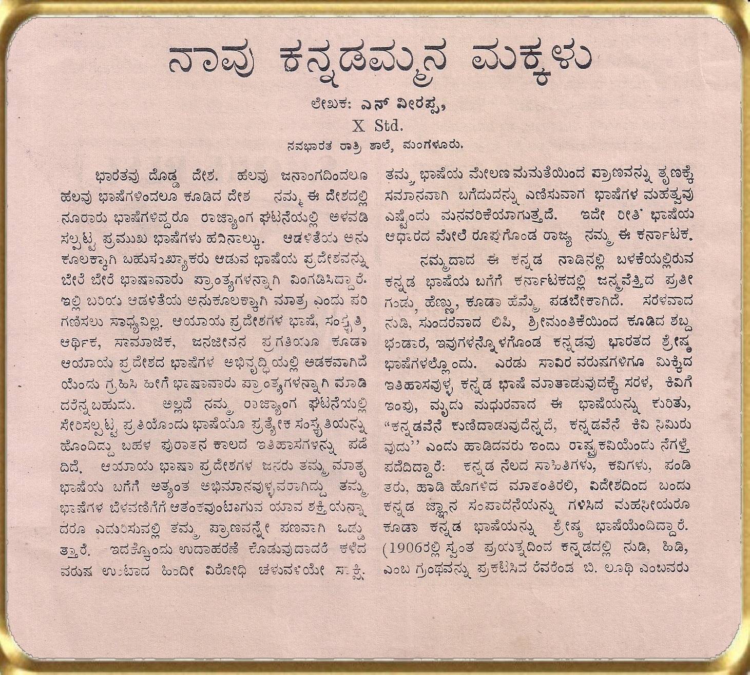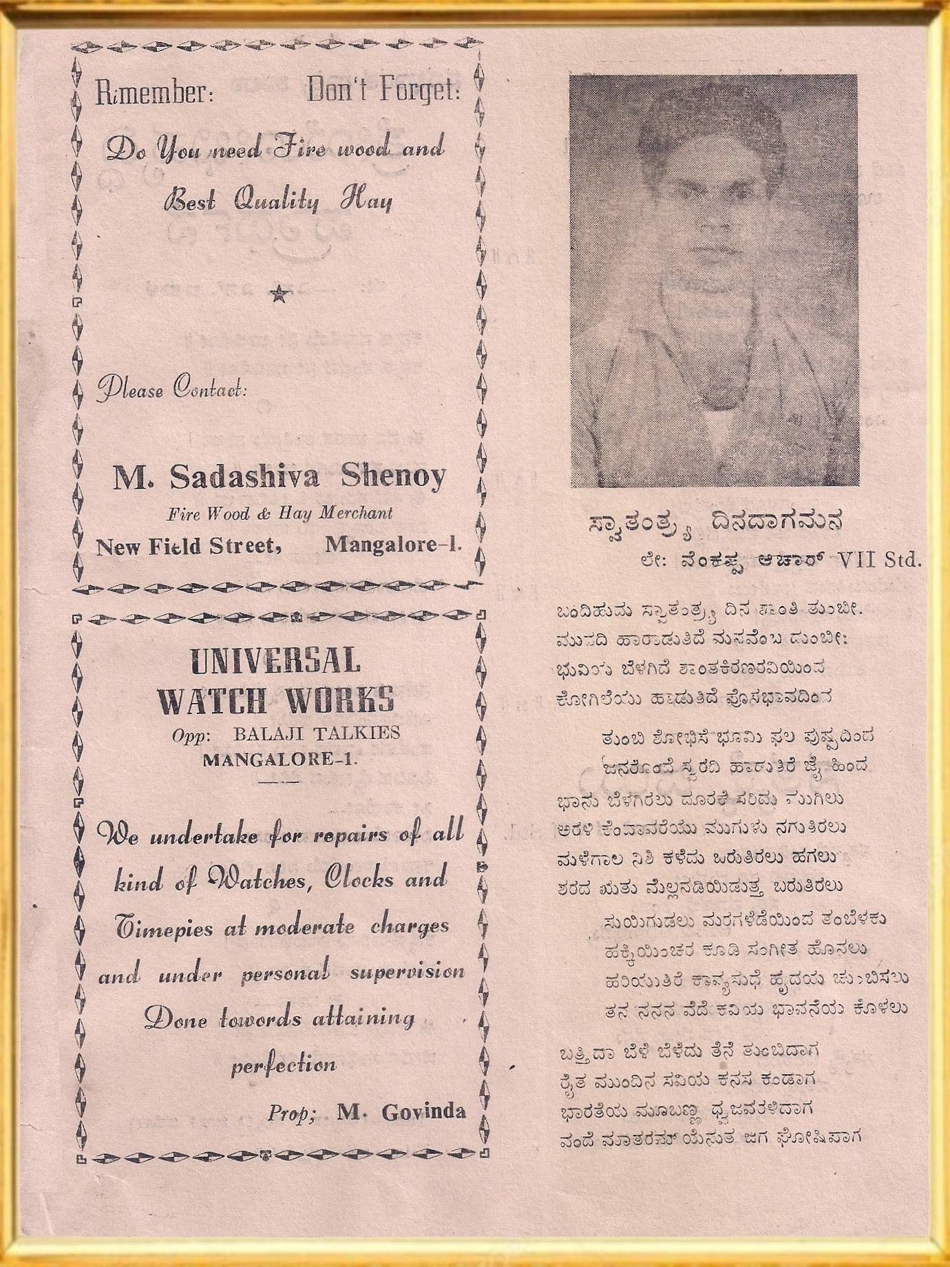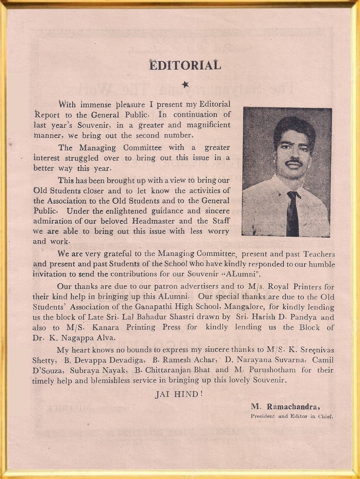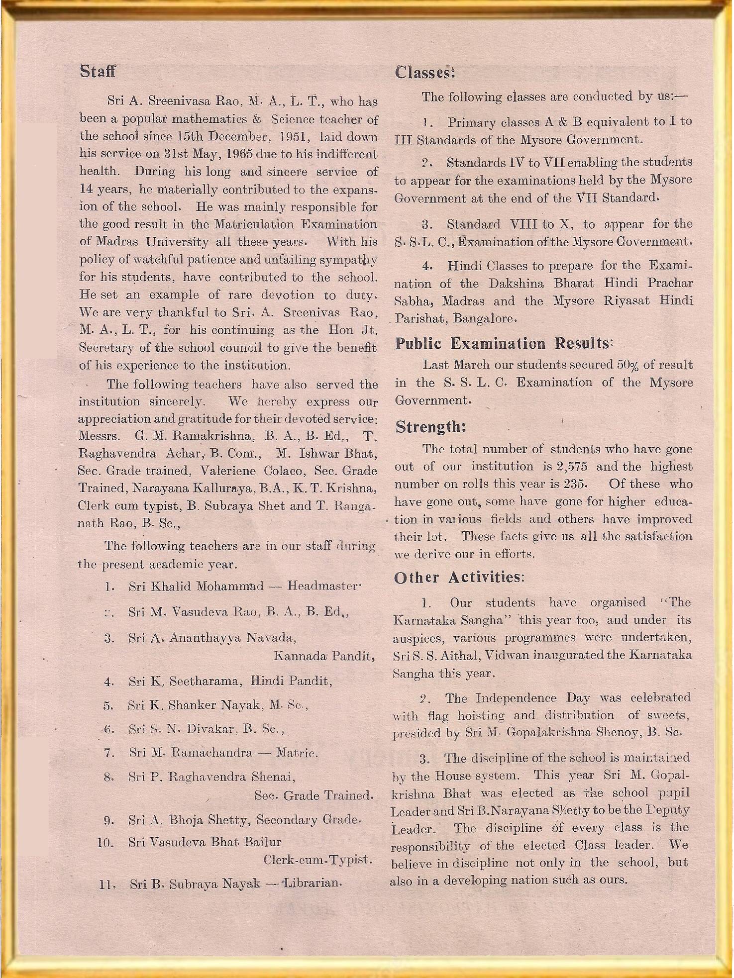 They brought out the first edition of their Souvenir “ALUMNI” in 1965 edited by Sri M. Ramachandra, President of the Association. This issue of “ALUMNI” was dedicated to the following four Distinguished Personalities in respectful application of their valuable Services to the Navabharat Night High School – Dr. K. Nagappa Alva, M.B.B.S., MLA, President of the school from 1950 to 1961 (former Health Minister of Govt. of Mysore), Sri U. Keshava Rao, B.A., L.T., Vice President of the School from 1954 to 1965, Smt. K. Radha L. Rao, B.A., L.T., Honorary Joint Secretary of the school from 1950 to 1965, Sri A. Sreenivasa Rao, M.A., L.T., Best Teacher of the School from 1951 to 1965. click here for pic