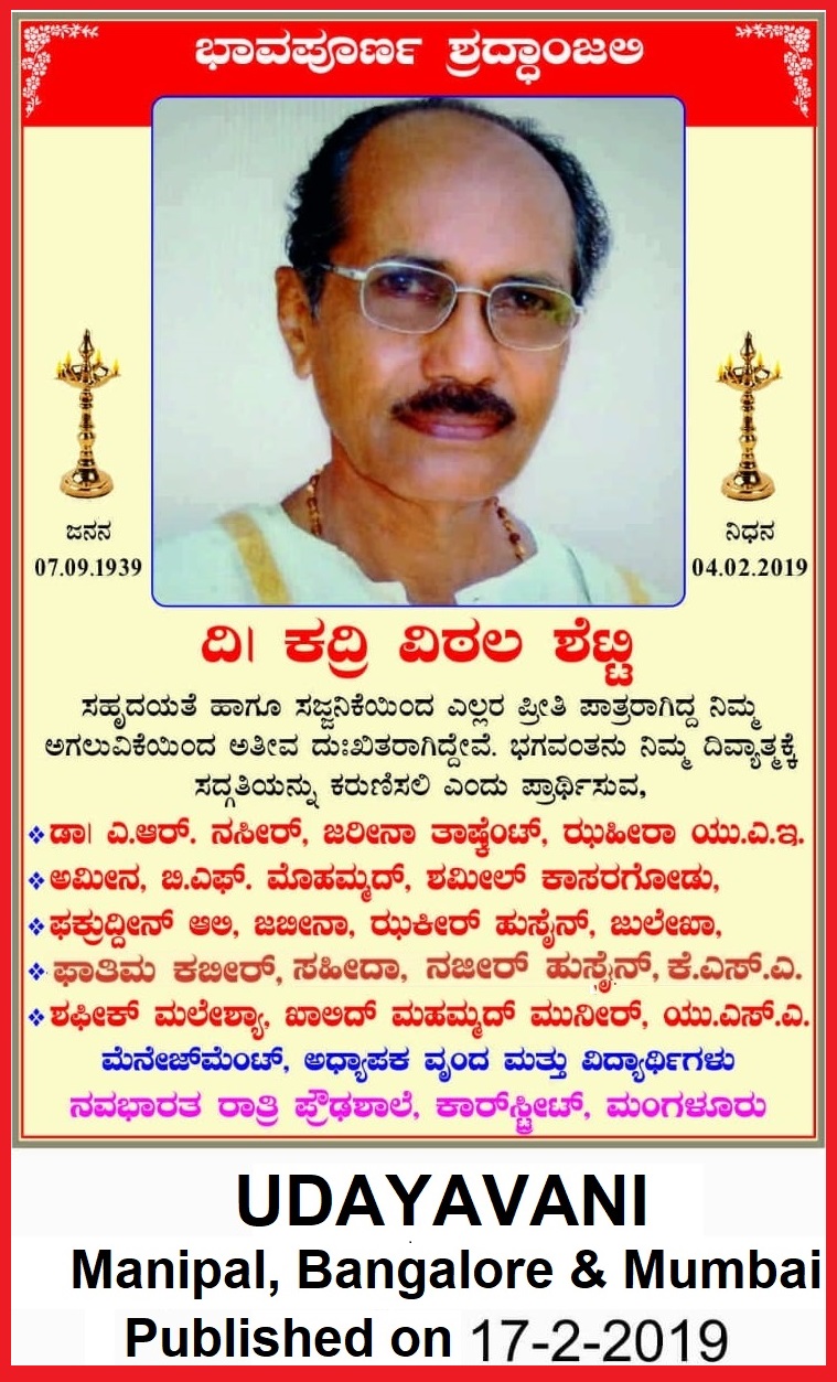 ಉದಯವಾಣಿ ಪತ್ರಿಕೆಯ ಶ್ರದ್ಧಾಂಜಲಿ: 4ನೇ ಫೆಬ್ರುರಿ 2019